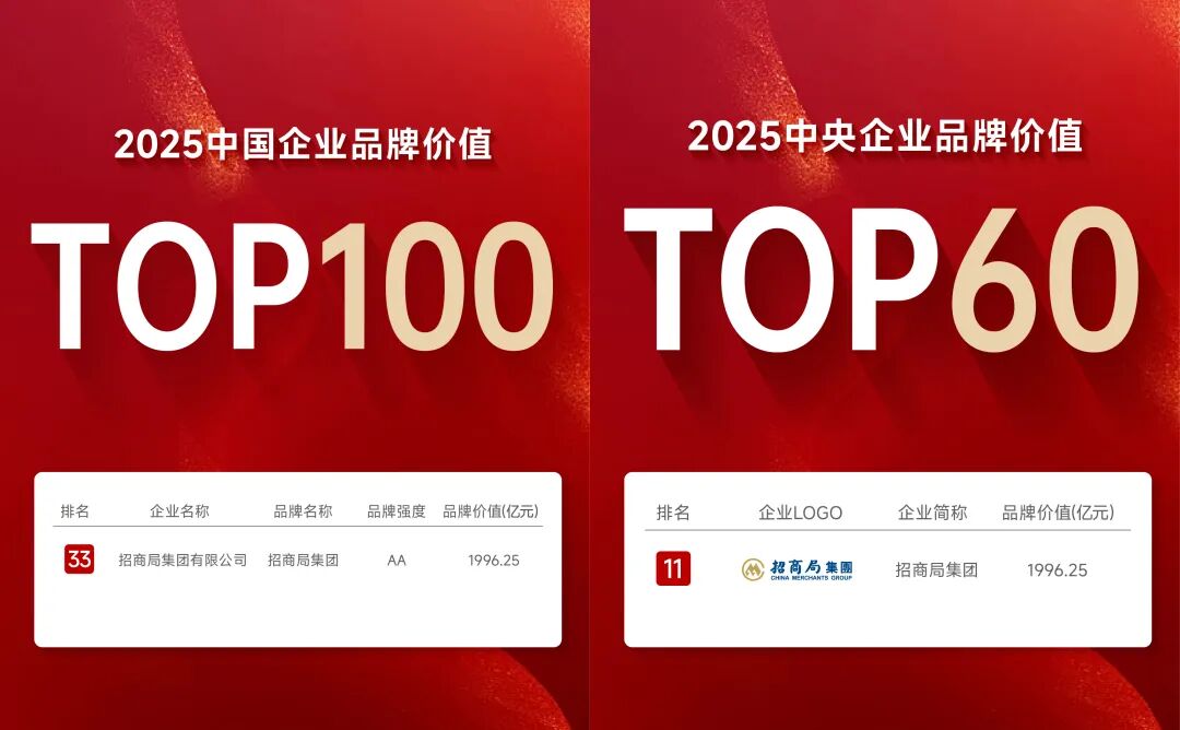 招商局集团在中国企业品牌价值TOP100榜单、中央企业品牌价值TOP60榜单中分别位列第33位和第11位。集团旗下“招商港口(001872)CMPort”企业品牌、招商银行(600036)“金葵花”服务品牌分别入选中央企业品牌引领行动第二批创建成果,展现“百年招商局”的品牌力量,闪耀百年“金字招牌”的高品质光芒。