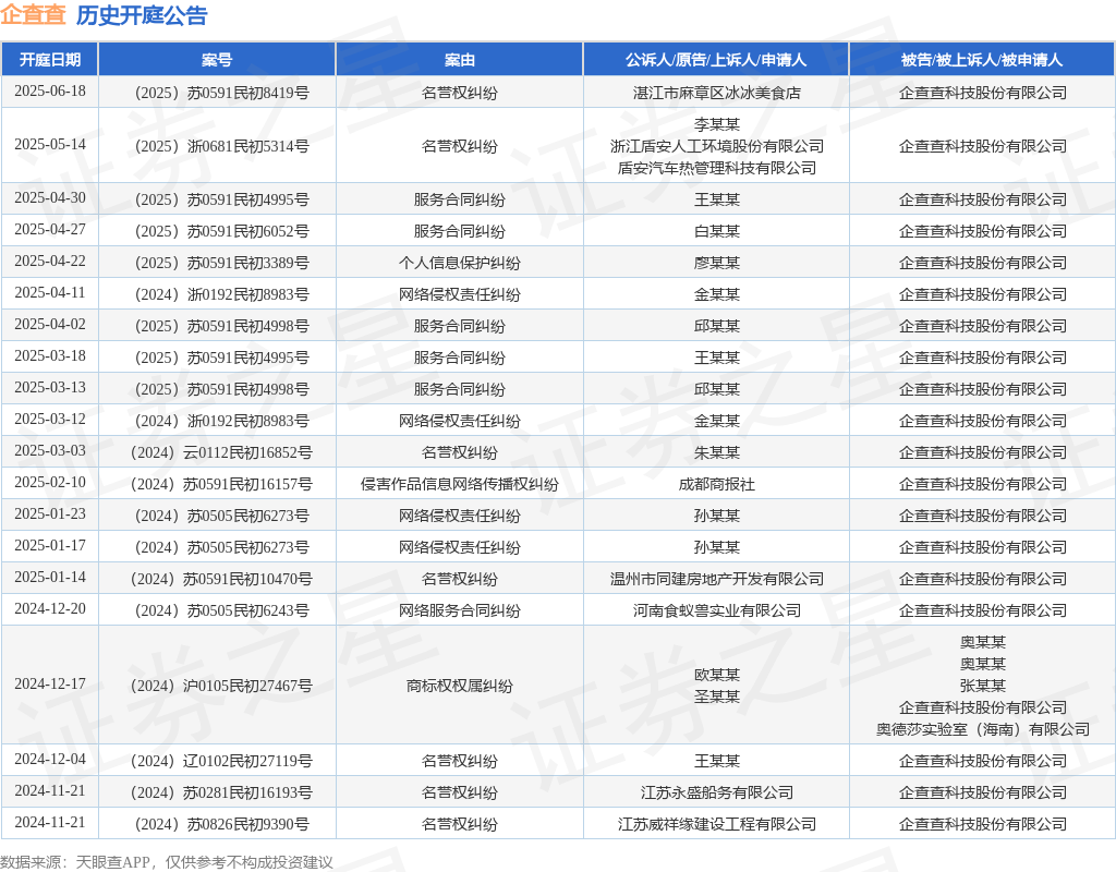 案号:(2025)浙0681民初5314号审理法院:诸暨市人民法院案由:名誉权纠纷当事人信息: 原告/上诉人:李某某、浙江盾安人工环境股份有限公司、盾安汽车热管理科技有限公司 被告/被上诉人:企查查科技股份有限公司开庭日期:2025年5月14日根据统计,近一年内以企查查科技股份有限公司为当事人的历史开庭公告有23则,其中案由为“名誉权纠纷”的公告以7则居首,其次为“服务合同纠纷”有5则,“网络侵权责任纠纷”有5则。历史开庭公告(前20条)如下: