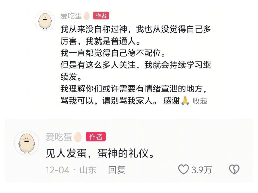 在这个每个人都能火15分钟的年代,遍地都是短暂又辉煌的“神”。面对突如其来的流量和追捧,“爱吃蛋”多次表示这是意外。他在《生活帮》的采访中透露,自己爆火后非常惶恐非常紧张,连续三天没怎么睡着。他也觉得自己德不配位,希望大家叫他“小蛋”。