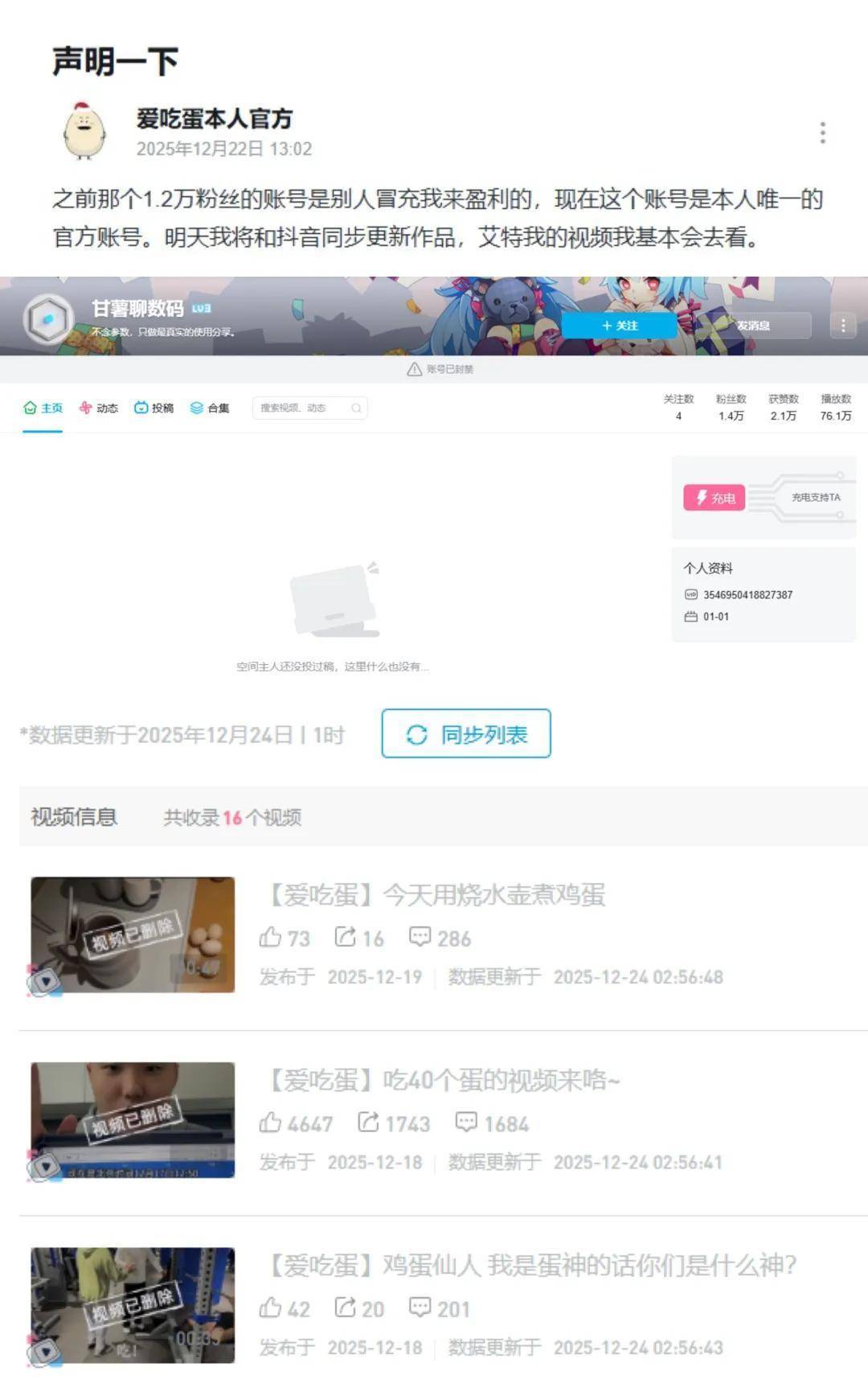 目前,多平台均存在一些名字类似“爱吃蛋”或者搬运其视频的账号。其中,B站账号“爱吃蛋本人官方”日前发布声明称,之前有一个1.2万粉丝的账号是别人冒充我来盈利的,现在这个账号是本人(在B站)唯一的官方账号。简介显示,该账号现已交由他人运营,IP地址为广西(“爱吃蛋”系山东人)。