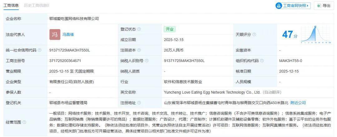 近日,热搜话题#400万煮鸡蛋大神开公司了# 引发围观。天眼查信息显示,郓城爱吃蛋网络科技有限公司于12月15日正式注册,法定代表人正是博主“爱吃蛋”冯昌绪,公司业务涵盖互联网销售、直播技术服务等。