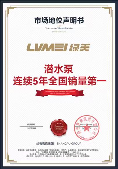 2025年9月,尚普咨询集团对潜水泵市场开展了专项研究,从行业趋势、竞争格局、企业经营等方面针对行业进行了全面、系统、深入的调研,以呈现绿美泵业在行业中的市场地位。此次,绿美泵业荣获尚普咨询集团颁发的“潜水泵连续5年全国销量第一”及“潜水泵全国销量第一”市场地位声明,这不仅凸显了绿美泵业的实力与市场影响力,更标志着其在潜水泵领域的领先地位,为潜水泵行业高质量发展树立了标杆。