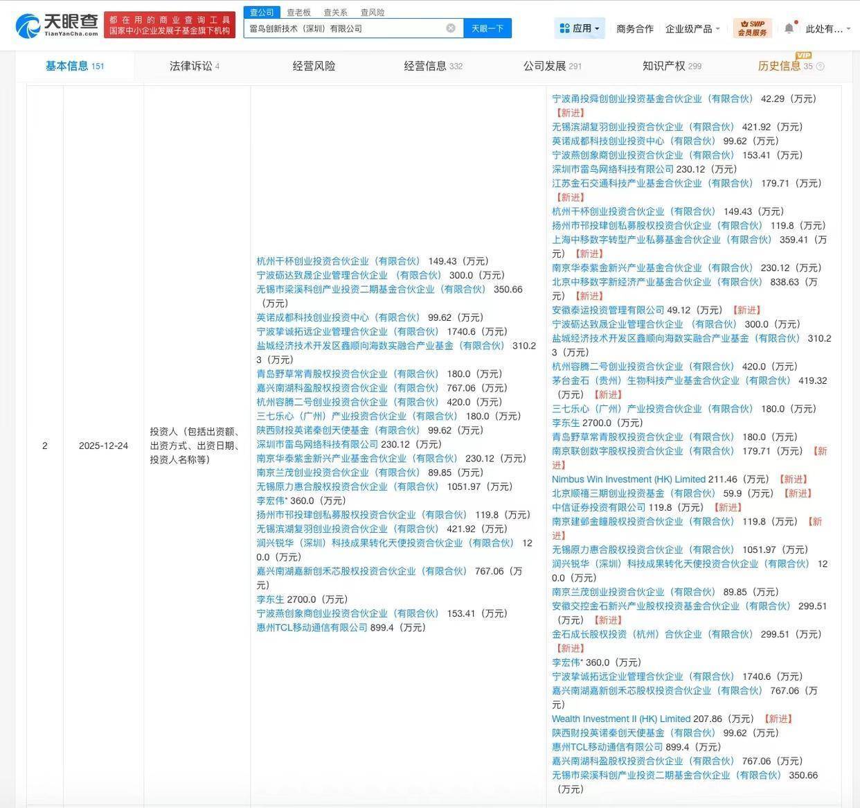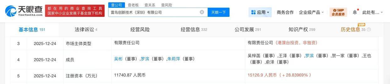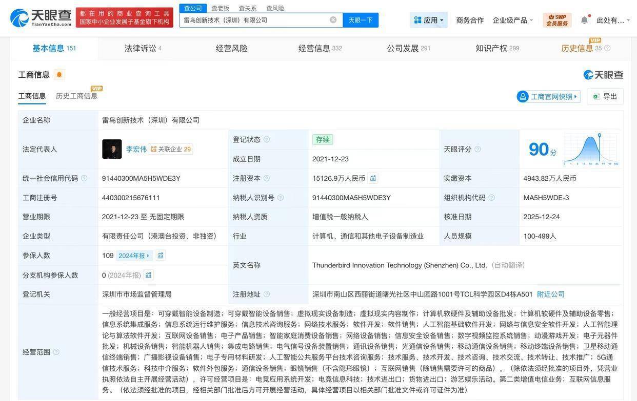 雷鸟创新技术(深圳)有限公司成立于2021年12月,法定代表人为李宏伟,经营范围含可穿戴智能设备制造、可穿戴智能设备销售、虚拟现实设备制造、虚拟现实内容制作、计算机软硬件及辅助设备批发、人工智能基础软件开发等,现由李东生、宁波挚诚拓远企业管理合伙企业(有限合伙)、惠州TCL移动通信有限公司及上述新增股东等共同持股。公开信息显示,雷鸟创新是一家专注于AR领域的创业公司,核心团队来自AR、手机和智屏等领域。产品涵盖显示、AI、人机交互等技术领域。