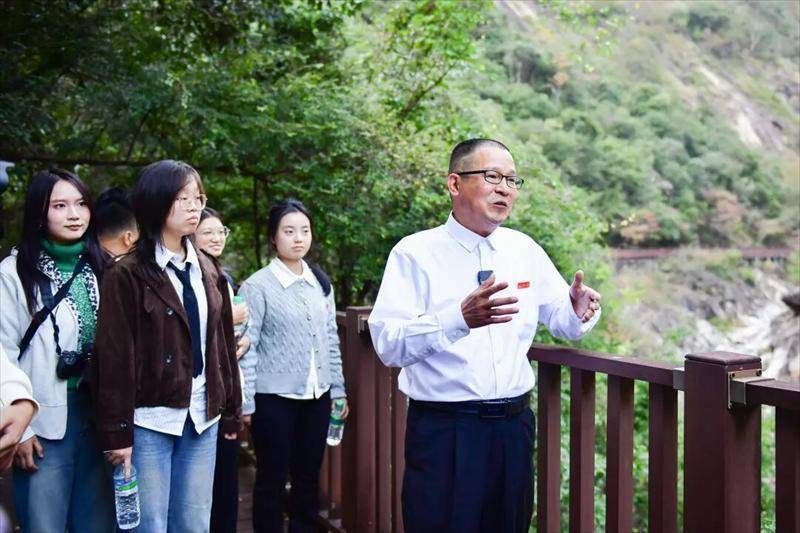 在横坑畲族村新时代文明实践站,师生们系统了解畲族刺绣、山歌与图腾文化,并在非遗传承人指导下体验打锡工艺,感受传统技艺的匠心传承。在上寨村革命旧址,青马宣讲团成员讲述“三双布鞋”的红色故事,带领同学们感悟信仰力量。在燕子岩景区,学院教师结合丹霞地貌现场讲解地质知识,景区讲解员同步普及生态保护理念,实现红色文化与绿色生态的有机融合。